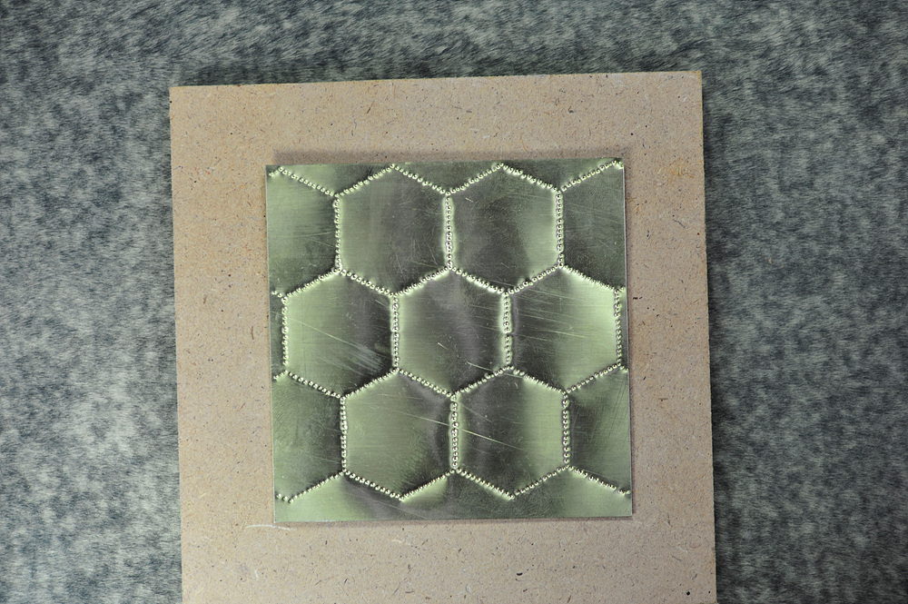 도안에 표시된 빨강점 2개의 점에 구멍을 크게 내주는 작업을 합니다. 이 구멍으로 가는 철사 2개가 통과해야 하기 때문에 황동판 앞뒤로 번갈아 가며 망치로 강하게 때려주면 구멍이 뚫리면서 넓혀집니다.