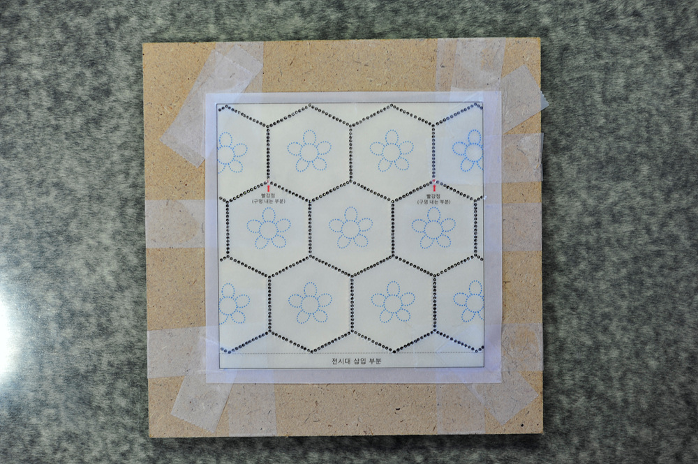 황동판을 뒤집어 문양이 튀어 나온 뒷면을 위로 하게 해준 다음 다시 꼼꼼히 테이프로 부착해줍니다. 이후 도안을 다시 겹쳐서 그대로 부착해 줍니다. 이제 내부의 파랑 연꽃잎을 제작할 차례입니다.