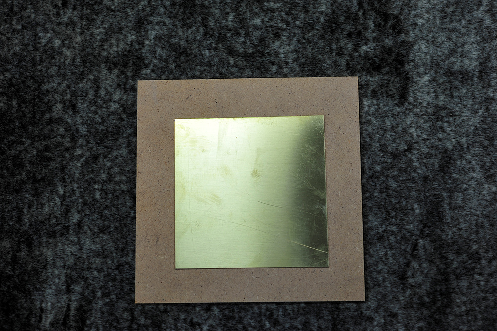 도안을 떼어낸 후 황동판에 부착된 고정 테이프도 제거해 줍니다. 테이프를 제거하면 사진에서 보이는 것처럼 황동판이 휘어지는 것을 볼 수 있습니다. 황동판을 뒤집어 망치로 골고루 때려서 어느정도 펴준 후 양손을 이용하여 앞뒤로 조심스럽게 구부려 가며 완전히 편평하게 펴줍니다. 절대로 황동판이 꺾이도록 구부리면 안됩니다.