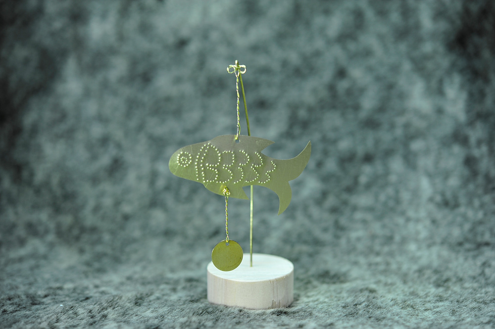 완성된 배경판을 전시대의 홈에 끼운 후 잉어 장식품과 잘 조화가 되어 전시될 수 있도록 영락고리(철사)나 영락(원형 황동판)을 조정해 줍니다.