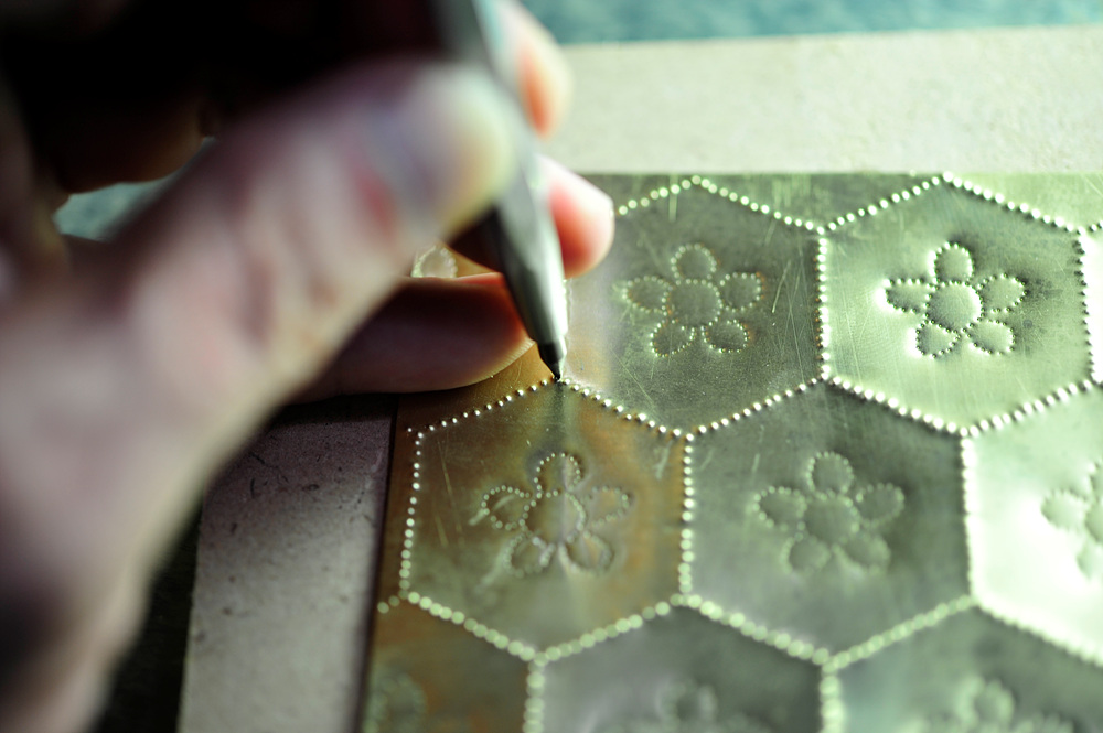 문양을 모두 찍어낸 후 빠진 부분이 없는지 확인해 봅니다. 일정한 간격으로 점열들이 이어지는 확인해 보고 사진(빨강동그라미)에서 보이는 것처럼 중간에 점이 빠져 있다면 때린 방향에 맞게 다시 점을 찍어 줍니다.